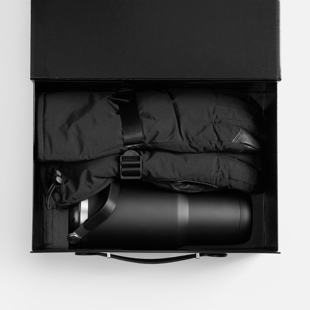 варежки - полиэстер 100%, утеплитель - 3M Thinsulate, плотность 100 г/м²; вставки - натуральная кожа; внешняя стенка термостакана - нержавеющая сталь, 201, внутренняя стенка - 304; крышка - пластик; коробка - переплетный картон; искусственная кожа